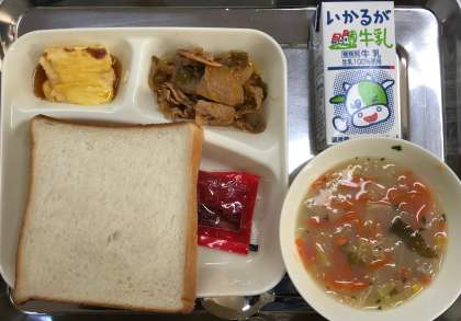 今日の給食は、久しぶりの食パンでした。トーストにして食べたいとの意見も聞きますが、ジャムを塗って美味しくいただきました。