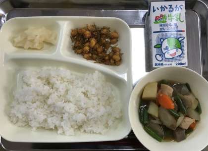 生徒に受けたり、受けなかったりの「じやこ豆」も美味しい。乾燥大豆を60分水に浸し、でん粉をつけて揚げて砂糖と醤油で味付け。仕上げは、いりごま(白)をまぶして出来上がり。