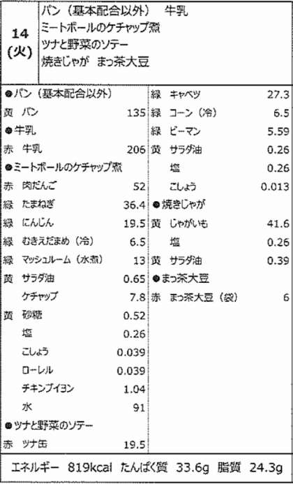 メインのおかずは、ミートボールのケチャップ煮。名前の通りの料理でした。ツナと野菜のソテーは、ツナの味がしっかりと効いていて美味でした。