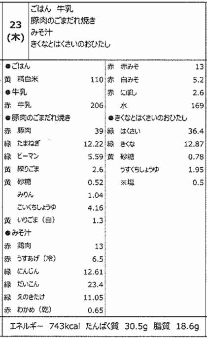 今日のメインのおかずは、豚肉のごまだれ焼き。ごまの香ばしいにおいが印象的でした。菊菜と白菜のお浸しも柔らかく美味しかったです。そして、具沢山のみそ汁が身体を温めてくれました。