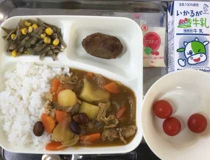 今日の給食は、生徒に大人気のカレーライス。「豚肉と金時豆のカレーライス」でした。焼きミニハンバーグも付いて、ちょっとリッチな雰囲気。カレーの日は、ご飯も完売します。