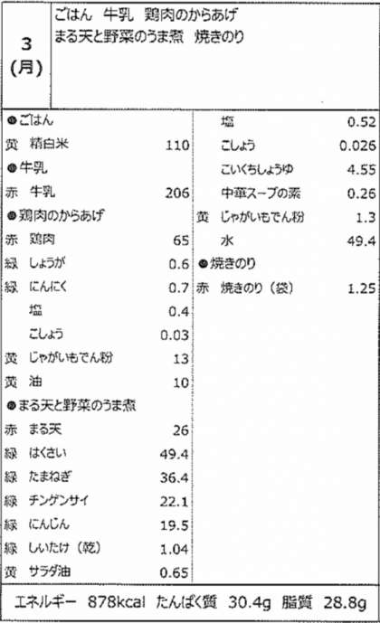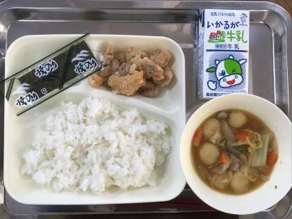 今日のおかずは、鶏肉の唐揚げとまる天と野菜のうま煮。鶏肉の唐揚げは、衣がパリッと美味でした。まる天と野菜のうま煮は、具沢山で味付けもバッチリでした。(まる天とは、たらやイトヨリダイといった白身の魚に調味料を加え、丸く形を整えて油で揚げたものです。卵は、使用していません。)