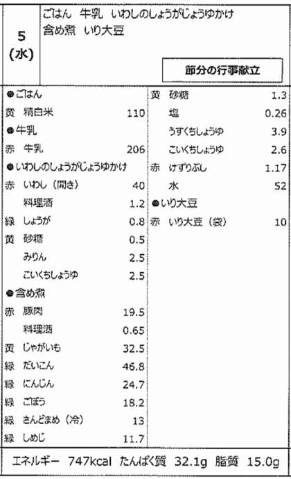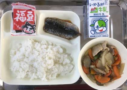 今日の給食では、節分の行事献立として「イワシの生姜じょうゆかけ」と「いり大豆」が出ました。(2月の献立より)