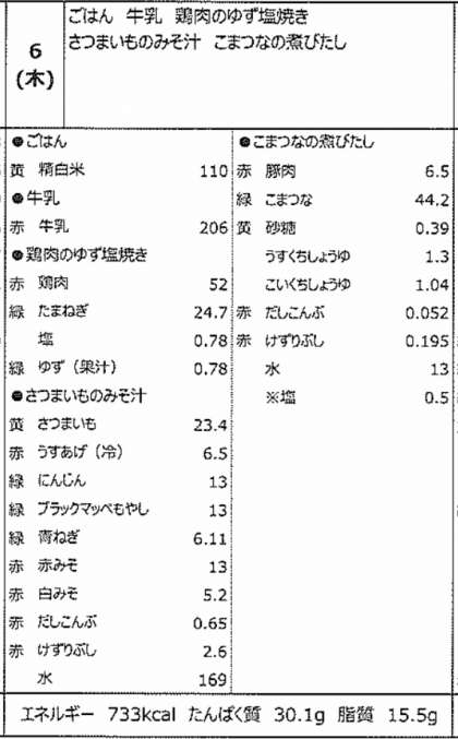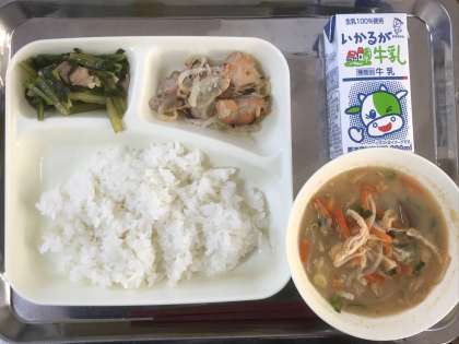今日の給食のおかずは、鶏肉のゆず塩焼きでした。ゆずの酸味が食欲を誘ってくれました。みそ汁も具沢山。さつま芋のほっこり甘さが美味でした。