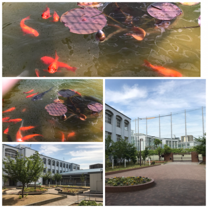 中庭の池の鯉や金魚の動きも活発になっています。池の中の睡蓮の花も蕾をつけています。