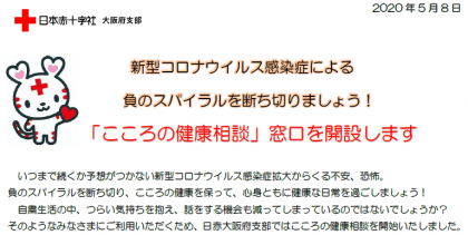 日本赤十字社大阪支部の新型コロナウイルス感染症に対する「こころの健康相談」窓口の開設についてお知らせをいただきました。
