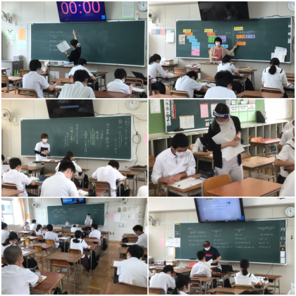 授業の方も教室に半分の生徒しかおらず、とても落ち着いた状態で進められています。授業の進行も早く、普段声を掛けられないところまで声が掛けられているところもあり、少人数での授業の良いところが出ています。