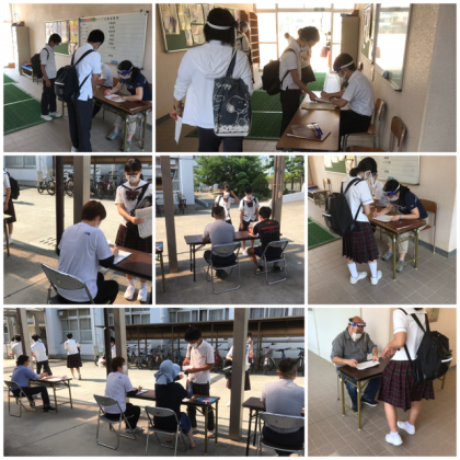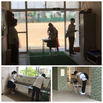 登校してきた生徒の皆さんは、校門から校舎へ各学年が分散する経路で学年の受付へ向かいます。受付の手前で「手・指」をアルコール消毒します。その後、受付で健康観察表を出し、健康状態のチェックを受けます。チェックが終わると教室へ行きカバンを置いたら、水道で手洗いをします。