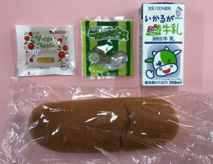 今日の給食は、コッペパン、リンゴジャム、牛乳、抹茶の大豆でした。
