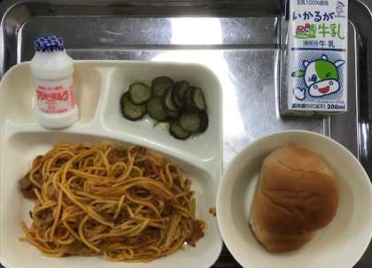 記念すべき最初のおかずは、ミートスパゲティときゅうりのピクルス、発酵乳でした。