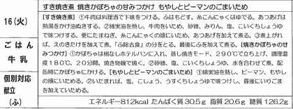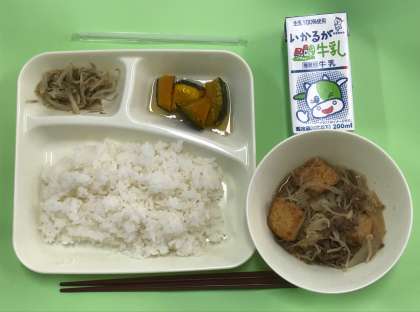 今日は、すき焼き煮・焼きかぼちゃの甘みつかけ、もやしとピーマンのごま炒め、そしてご飯と牛乳でした。