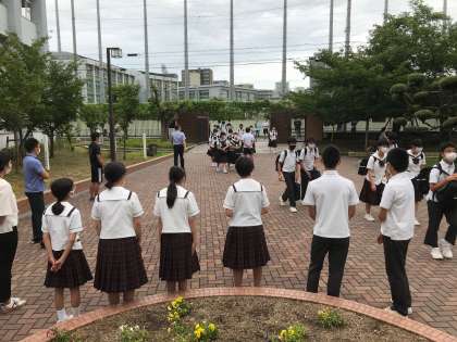 先日行われた「生徒会選挙」で信任を受けた6名の生徒会役員が、校門で登校する生徒の皆さんに「おはようございます」と大きな声で声を掛けています。