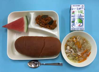かぼちゃのミートソースグラタン、スープにスイカでした。