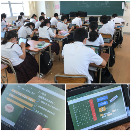 別の教室では、2年生の数学の授業でした。タブレットを使って、演習問題に取り組んでいました。自分のペースに合わせて、問題にとりくんでいました。