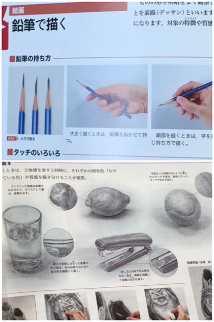 1年生の美術の授業では、鉛筆を使ってデッサンを描く練習をしていました。