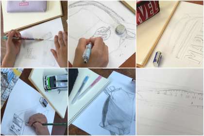 手元にある筆箱を観ながら鉛筆を動かしていました。鉛筆の濃淡や奥行き方向の線を描いて立体感のある筆箱が描かれていました。