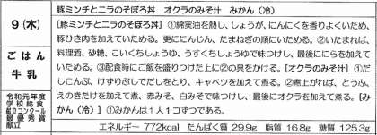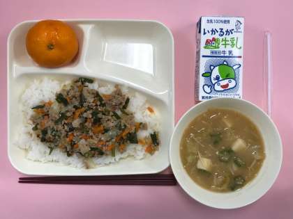 豚ミンチとニラのそぼろ丼、オクラのみそ汁、冷凍みかんでした。