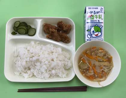 豚肉の香味揚げ、すまし汁、あっさりきゅうりでした。