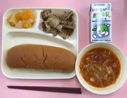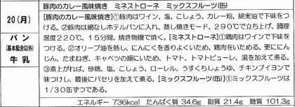 豚肉のカレー風味焼き、ミネストローネとミックスフルーツでした。