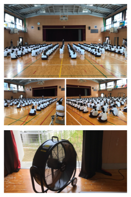 コロナ感染や熱中症予防のために体育館に大型扇風機が、4台導入されています。(写真最下段)