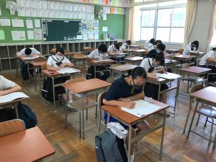 開始直前まで、暑い廊下で問題集を開いて(検定会場の教室の中では、問題集等を開けないため)最後の確認をしていました。特に3年生は、全員が廊下に出て確認していました。その姿に感動を覚えました。