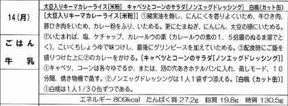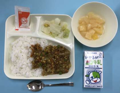 キーマカレーとは、ひき肉を使ったカレーのことです。今日は、ひき肉のほかに、ひきわり大豆もはいっていました。大豆には、カルシウムや鉄、食物繊維が豊富に含まれています。小麦粉の代わりに米粉を使ったカレールーの素で味付けしていました。
