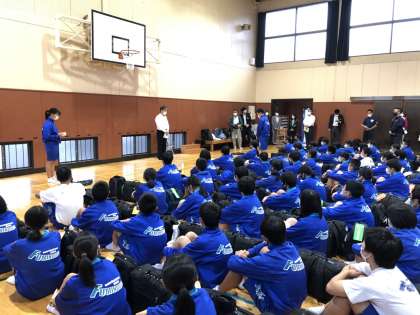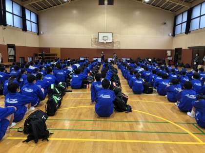 予定よりも早く、宿舎に到着しました。宿舎にある体育館で入館式です。