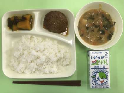 和風ハンバーグと味噌汁、かぼちゃのいとこ煮でした。