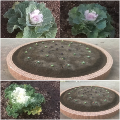 シャベルで土を掘り返し、桜の落ち葉を埋め込み花壇の準備をしました。その後、葉ボタンをデザインに沿って植え込みました。