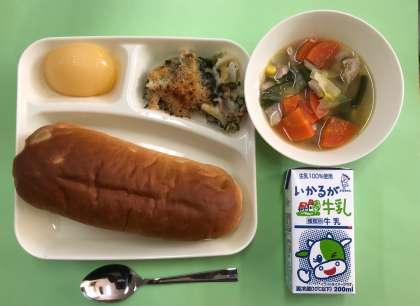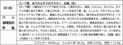 スープ煮、ほうれん草のグラタンと白桃(缶)でした。