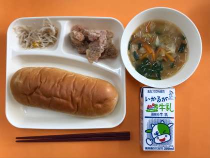 今日は、ご飯に牛乳。鶏肉の唐揚げ、中華みそスープともやしとコーンの甘酢あえでした。