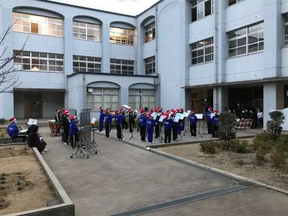 特に広報はなく、突如始まったミニコンサート。中庭で活動する他の部活の部員も吹奏楽部の演奏するクリスマスソングに耳を傾けていました。