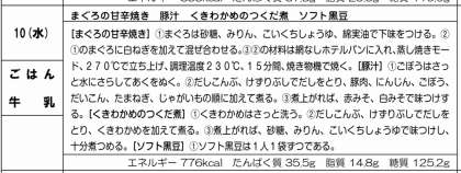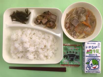 まぐろの甘辛焼き、豚汁と、茎わかめの佃煮とソフト黒豆でした。