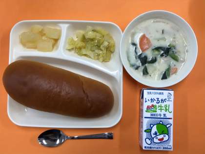 ほうれん草のクリームシチュー、キャベツのサラダと洋梨(カット缶)でした。