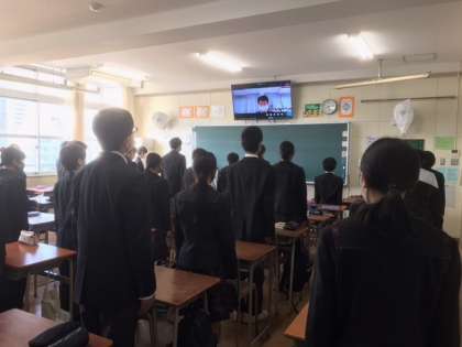 皆が興味津々な中、美化委員会からの報告と、先生からの「凡事徹底」という言葉についての話を教室で真剣に聞いていました。