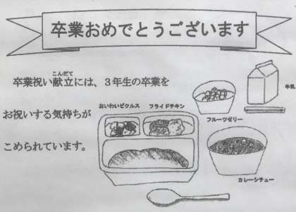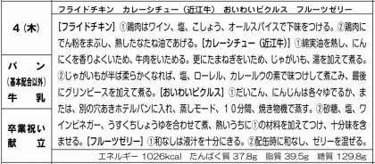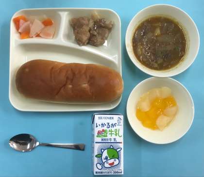 フライドチキンにカレーシチュー(近江牛)、お祝いピクルスとフルーツゼリーでした。
