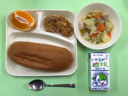 豆腐のミートグラタン、押麦と野菜のスープ、デコポンでした。