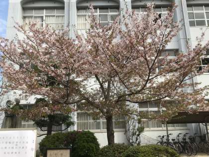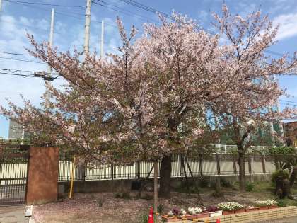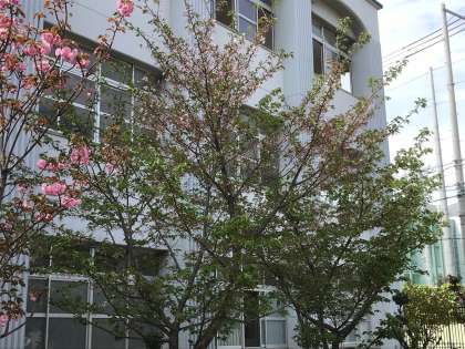 校門横の桜の花は、新緑の若葉が目立つようになってきました。