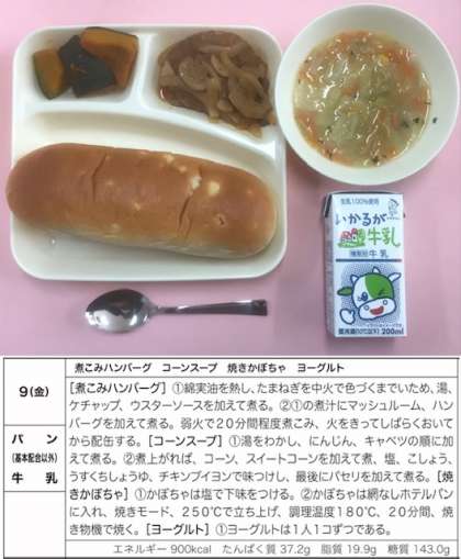 煮込みハンバーグ、コーンスープ、焼きカボチャとヨーグルトでした。