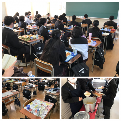 新入生は、中学校に入学してからはじめての給食でした。パンの大きさが大きくなっていたり、おがず量が増えたりしていることに驚いていました。