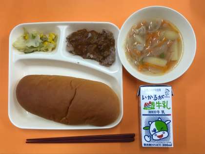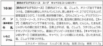 豚肉のデミグラスソース、スープ、キャベツとコーンソテーでした。