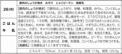 豚肉の生姜焼き、みそ汁、じゃこピーマンと、発酵乳でした。