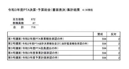先日行われました「PTA決算・予算総会(書面表決)」の結果が出ましたので、お知らせします。