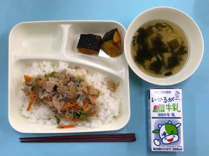 今日は、豚丼と湯葉のすまし汁、かぼちゃのしょうゆ焼きでした。