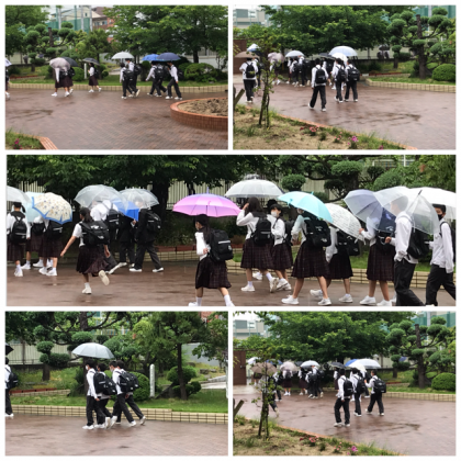 生徒が下校した後、雨足が強くなっていました。タイミング次第では、ずぶ濡れになってしまいます。天気予報を確認したり、折り畳みの傘を持つことで、雨に濡れることを防ぎましょう。体調を崩さない工夫をお願いします。