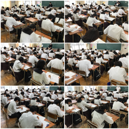 (写真下)テスト開始直後の緊張した雰囲気の3年生の教室です。
