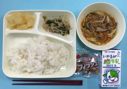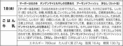 麻婆春雨、チンゲン菜ともやしの甘酢和え、アーモンドフィッシュと洋梨(カット缶)でした。
