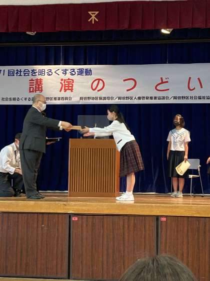 7月3日(日)阿倍野区役所にて「社会を明るくする運動」作文コンテスト表彰式がおこなわれました。その中で、2年生の山岡優里愛さんの作文「想像力の豊かな人に…」が優秀賞に選ばれ、表彰を受けました。おめでとうございます。