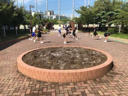 朝から、臨時園芸部2人(生徒会と水泳部の有志)の活躍で円形花壇の植え替えの準備をしました。