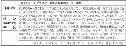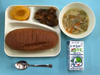 茄子のミートソースグラタン、鶏肉と野菜スープと黄桃(缶)でした。